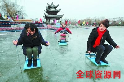 陶然亭公园天然冰场,游客体验冰车。 本报记者 吴镝摄