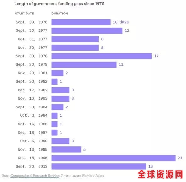 ▲1976年以来美国历次政府关门时长(图表来源:Axios)