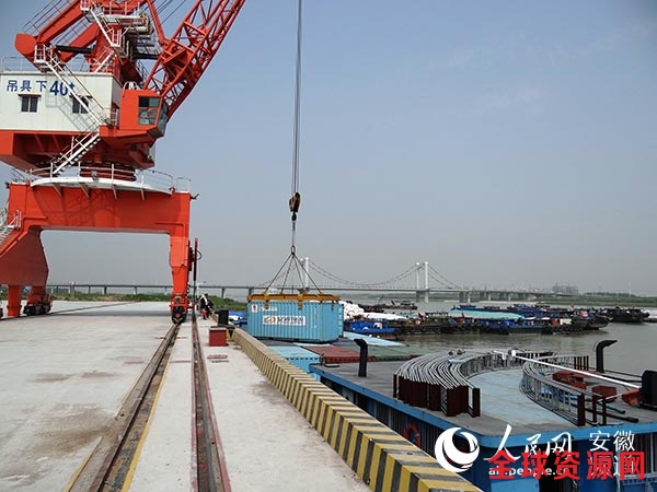 在蚌埠新港码头上,一个个集装箱被装上货船,通过淮河、洪泽湖水系直达连云港,再借港出海,将蚌埠本地产品销往海内外。