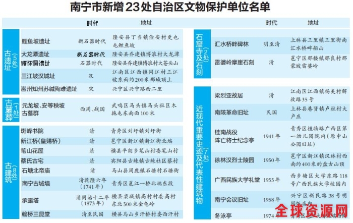 文物是不可再生的珍贵文化资源,是传承和弘扬中华优秀传统文化的历史根脉。经自治区人民政府核定,第七批自治区文物保护单位共计212处,其中南宁市共有23处入选,包括5处古遗址、1处古墓葬、8处古建筑、2处石窟寺及石刻、7处近现代重要史迹及代表性建筑物。