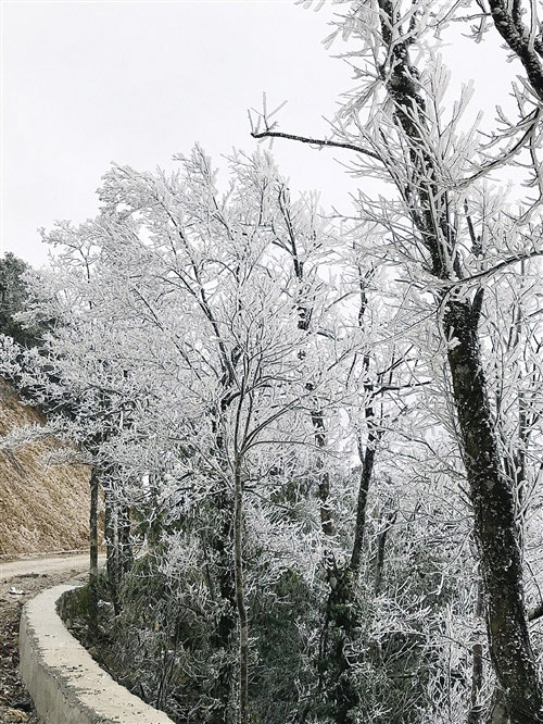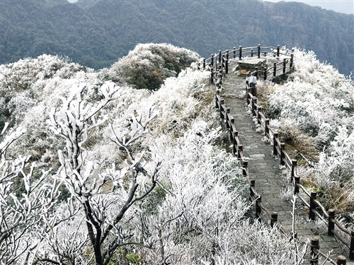 昨日,记者从南宁气象台了解到,虽然南宁城区26日已经“速冻”,但是大明山天坪上气温还在10℃上下,28日凌晨3点气温还有11.5℃,但4点就出现了逆温层瓦解,气温速降到1.9℃!昨日早晨最低气温只有-3.4℃,出现雨凇奇观,景区里银装素裹。