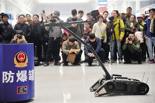 在现场,搜爆犬“泰森”引来了不少旅客的围观合影。“泰森”已经连续6年服务春运,即将退役的它,今年春运将站好最后一班岗。当天,南宁铁路公安处女驯导员黄晓莉带着 “泰森”在南宁东站进行搜爆表演。警犬与民警搭档,共同做好旅客的“安全卫士”。