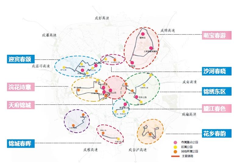 锦城公园—(益州大道)—天府大道赏花节点—(天府一街)—桂溪生态公园(全程大约2.5公里)