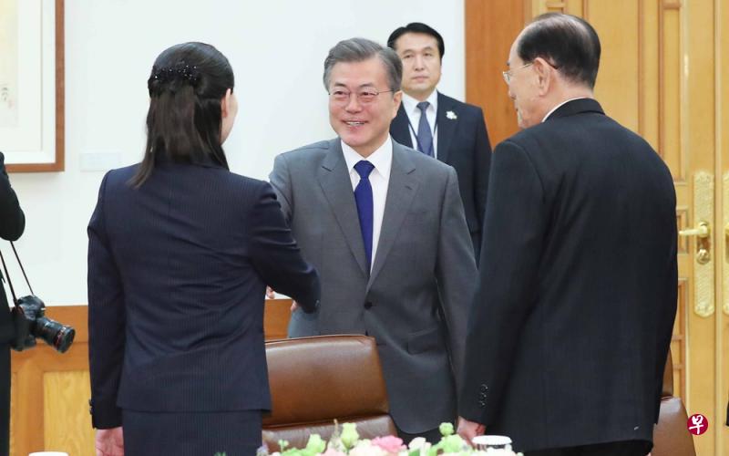 韩国总统文在寅同朝鲜高级别代表团成员进行会谈,当中包括朝鲜最高领导人金正恩胞妹金与正。