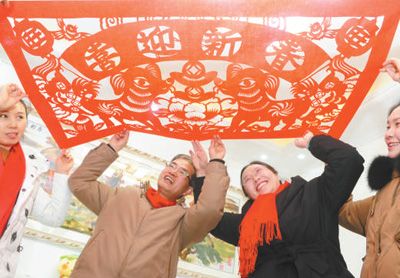 图二2月15日,在安徽省阜阳市临泉路白衣桥安置区内,安置户董杰珍(前一)和当地剪纸艺术家一起将喜庆窗花张贴到窗户上。王 彪摄(人民视觉)