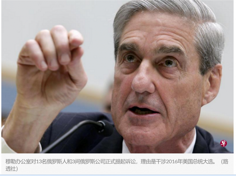 当地时间2月16日,美国司法部宣布“通俄调查”特别检察官穆勒的办公室对13名俄罗斯人和3间俄罗斯公司正式提起诉讼,理由是干涉2016年美国总统大选。美国总统特朗普说,这正好证明他与俄罗斯没有勾结。