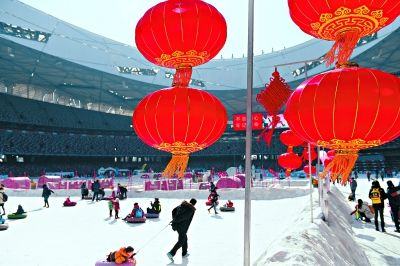 春节假期,鸟巢冰雪季场地里人头攒动,许多大人和孩子在这里尽情嬉戏,享受冰雪运动带来的快乐。本报记者 李继辉摄