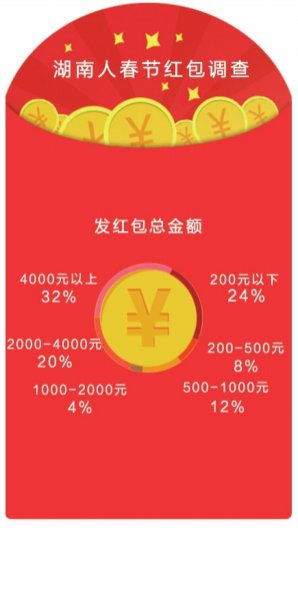 发红包、收红包是中国人过春节的传统习俗。春节期间,你共发出去或收到了多少红包?近日,潇湘晨报通过微信微博等新媒体平台发布了"2018 湖南春节红包调查",统计发现,湖南人在发红包方面可谓" 大气"。发红包金额过1000 元的投票数达到近60%,其中更有超过半数的发红包金额在4000 元以上。对此,有网友评论大呼:壮哉我大湖南人!
