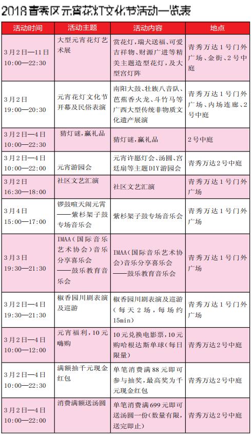 在青秀万达1号门外广场还设置有灯谜区,参加猜灯谜游戏可赢取精美小礼品。以观赏花灯为主线,现场还配以广场民俗游园会,看气派的南阳大鼓、豪迈的壮族八音队闹元宵,欣赏到壮观的舞芭蕉香火龙表演,精彩的斗竹马表演,传统邕戏、国粹川剧变脸等一系列非物质文化遗产表演,还有适合一家人同乐的手工汤圆DIY等传统元宵游园会活动,元宵佳节看萌童才艺秀还能动动手做一碗属于自己的甜蜜汤圆,在观赏之余,还能参与其中,享受元宵阖家欢乐。