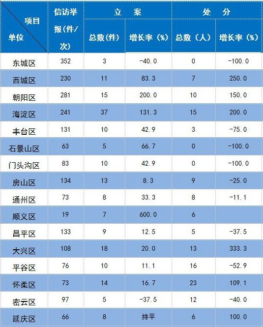 2018年1月北京市各区纪检监察机关纪律审查情况表