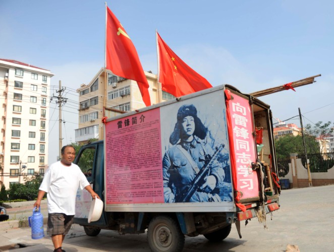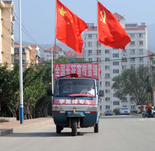 8日上午9点多,在烟台火车站广场前,一辆插着国旗的三轮车格外引人注目。车头上方一边是国旗、一边是党旗,两面旗帜在微风中自由舒展。车身一面是大幅的雷锋照片和雷锋精神解读文字,另一面是多家报纸发表的同一人物的整版报道。这辆三轮车的驾驶者是一个身高只有165厘米的四川老人刘光建。