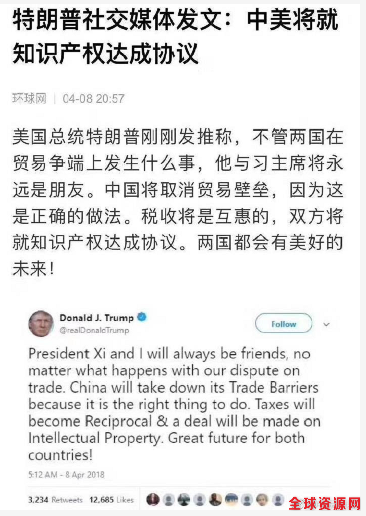 特朗普刚刚(4月8日)又发推了,他的推文称,不管中美两国贸易争端上发生什么事,他和中国元首将永远是朋友。他还说,“中国将取消贸易壁垒,因为这是正确的做法。税收将是互惠的,双方将就知识产权达成协议。两国将有美好的未来!