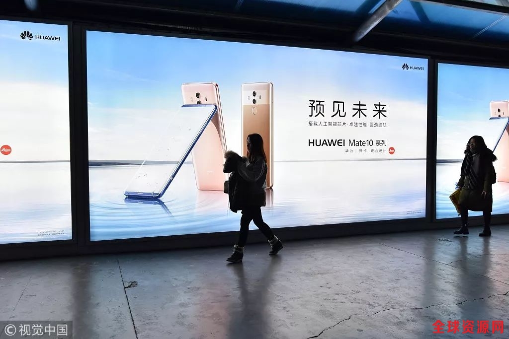 ▲2018年1月12日,上海地铁站内的华为手机广告前,上班族步履匆匆。图/视觉中国