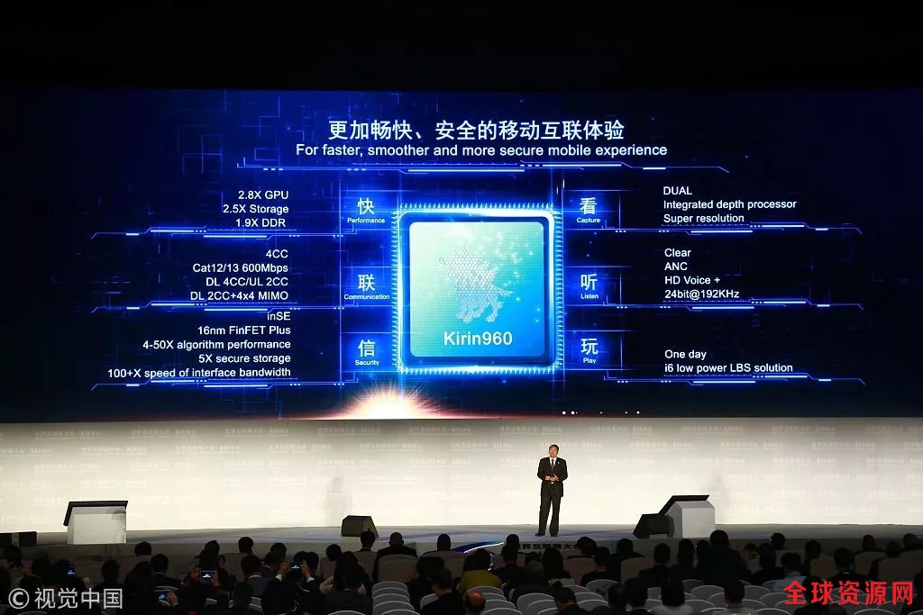 ▲2016年11月16日,第三届世界互联网大会“世界互联网领先科技成果发布活动”记者见面会。图为华为麒麟960手机SoC芯片。图/视觉中国