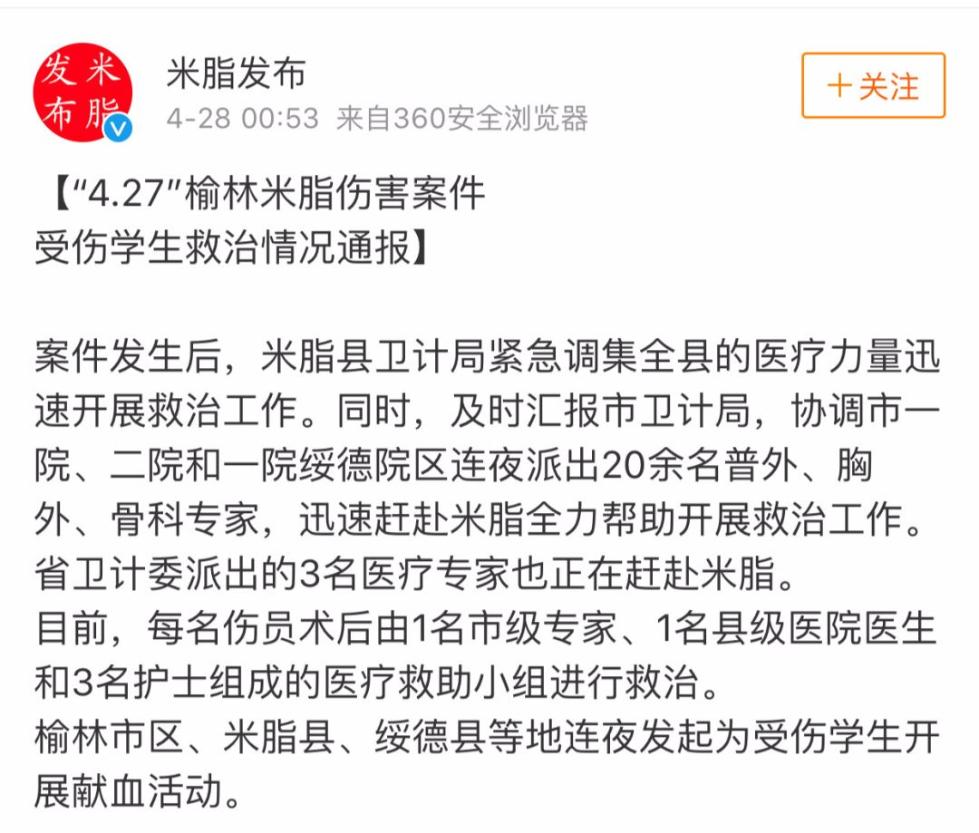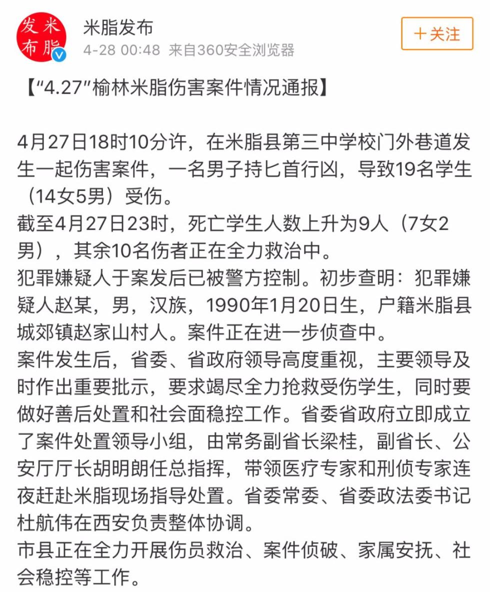 中共米脂县委宣传部官方微博@米脂发布 通报,4月27日18时10分许,在米脂县第三中学校门外巷道发生一起伤害案件,一名男子持匕首行凶,导致19名学生(14女5男)受伤。