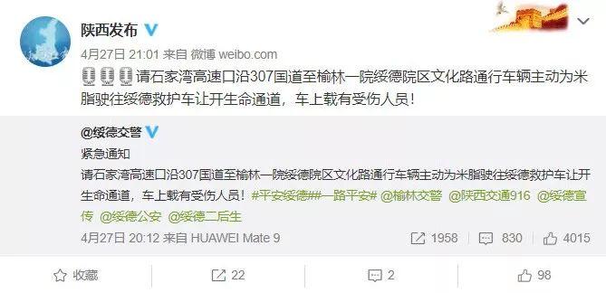当晚,@绥德交警 发布消息:请车辆主动为救护车让开生命通道,车上载有受伤人员!