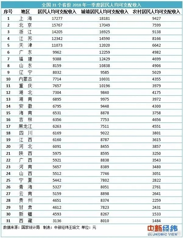 原标题:一季度收入排行榜来了!5省市人均可支配收入过万 看看河北排第几?