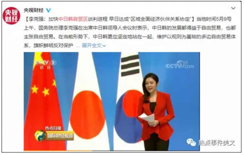据新华网5月9日电,当地时间5月9日上午,中国国务院总理在出席中日韩领导人会议时表示,中日韩的发展都得益于自由贸易,也都主张自由贸易。在当前形势下,中日韩更应坚定地站在一起,维护以规则为基础的多边自由贸易体系,旗帜鲜明反对保护主义和单边主义做法。要提升区域经济一体化水平,加快中日韩自贸区谈判进程,推动早日达成“区域全面经济伙伴关系协定”(RCEP),引领推动制定东亚经济共同体蓝图。