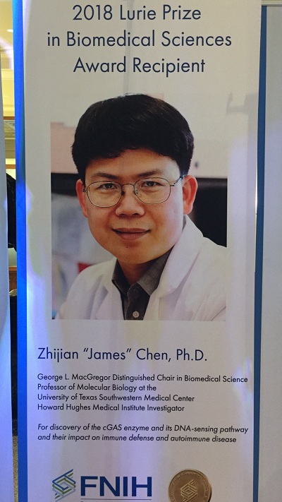 当地时间5月16日,美国国家卫生研究院基金会(FNIH)在美国首都华盛顿举行隆重仪式,向杰出华人科学家陈志坚博士颁发2018年度生物医学卢里奖(The Lurie Prize in Biomedical Sciences),以表彰其发现环鸟腺苷酸合成酶(cGAS)及其调控通路。