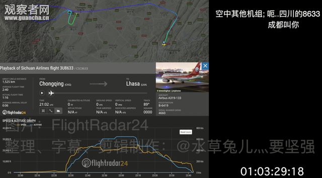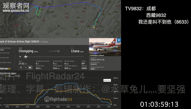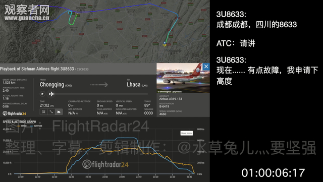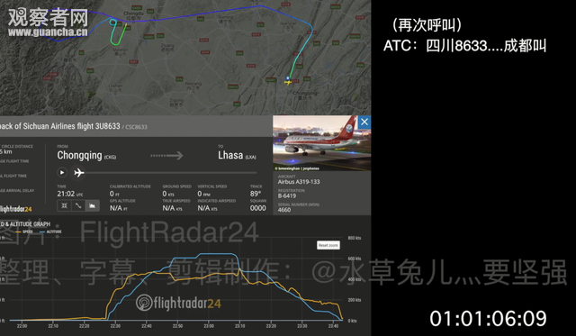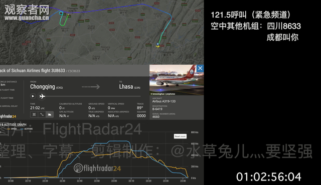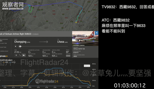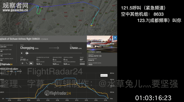 其中显示,在飞机出现故障后,机长十分沉着冷静地与ATC进行联系,“现在…有点故障”,申请下降高度和返航。而在报告完航班将备降成都后,机组便于ATC失去联系。ATC和空中其他机组人员尝试多次连续呼叫,“四川8633”,都无人作出应答。