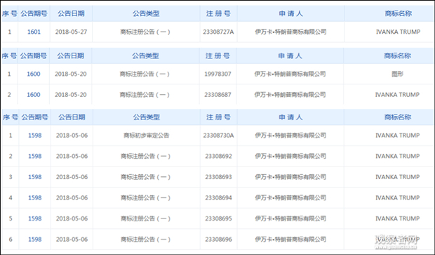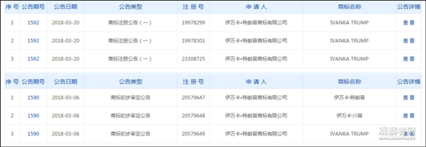 三个月来,伊万卡·特朗普商标有限公司在中国获批及初审的商标 中国商标网截图