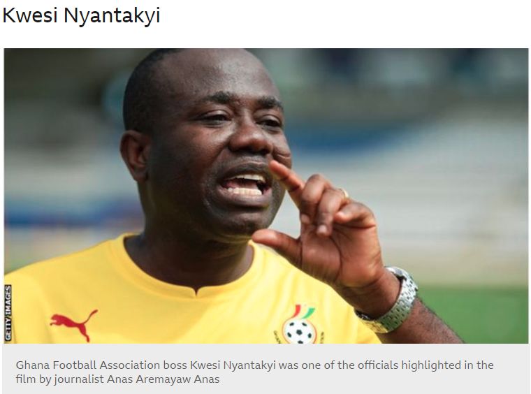 在BBC公布的另一段视频里,记者假扮的商人与加纳足协主席恩扬塔基(Kwesi Nyantakyi)在中东一家豪华酒店中会面,恩扬塔基把65000美元“购物经费”放到塑料袋中。