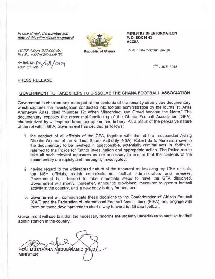▲北京时间6月8日凌晨,加纳政府发布公告,总统正式签署解散加纳足协的文件