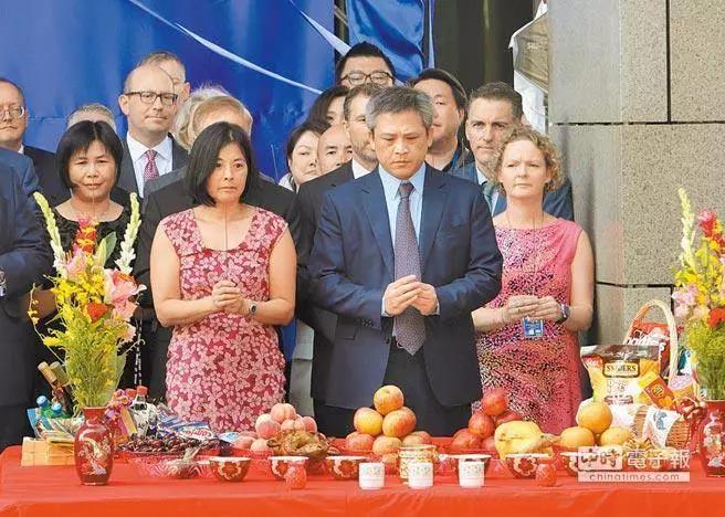 AIT处长梅健华及员工在香案前举香祈求新馆落成顺利平安,仪式显得不伦不类。