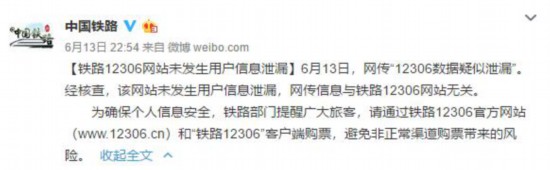 原标题:中国铁路总公司:12306网站未发生用户信息泄漏