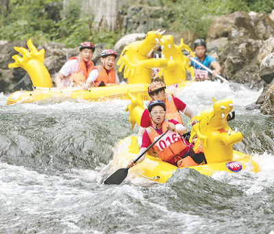 6月17日,2018年第七届中国宜昌朝天吼自然水域国际龙舟漂流大赛举行。图为于湖北兴山朝天吼景区参加龙舟漂流大赛的队员在比赛中。 本报记者 史家民摄