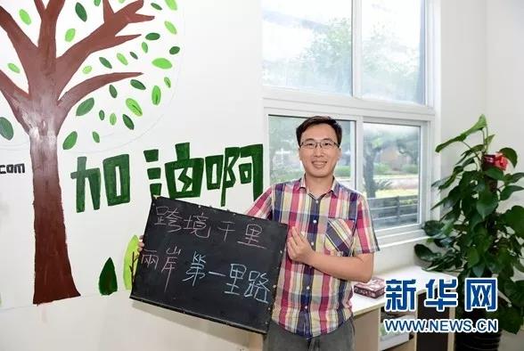 ▲台湾创业青年林柏年在厦门的公司里展示创业感言。 (新华社)