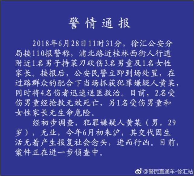 2018年6月28日11时31分,徐汇公安分局接110报警称,浦北路近桂林西街人行道附近1名男子持菜刀砍伤3名男童及1名女性家长。接报后,公安民警立即到场处置,在过路群众的配合下当场抓获犯罪嫌疑人黄某,同时将4名伤者迅速送医救治。目前,2名受伤男童经抢救无效死亡,另1名受伤男童和女性家长无生命危险。