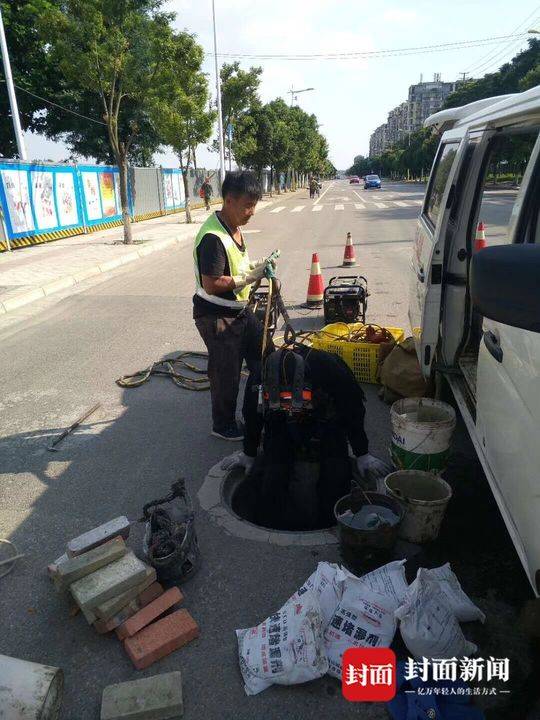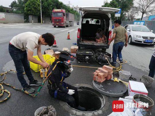 这是雨季杨杰处理得最多的情况,另外一种,是下井作业封堵下水管道。雨季排水不畅导致街道被淹,通常来说是由于地下管道的排水能力不一致导致的。“上游和下游的排水管道如果大小不一样,排水量就不一样,时间一长则会导致水流无法及时排出。”据杨杰介绍,蛙人此时的作用则是对排水管道进行“改造”,制作一个堵头将较大的排水管道进行封堵,当上下排水管道排水能力达到一致时,水流就能及时流动,街道被淹的情况自然就解决了。