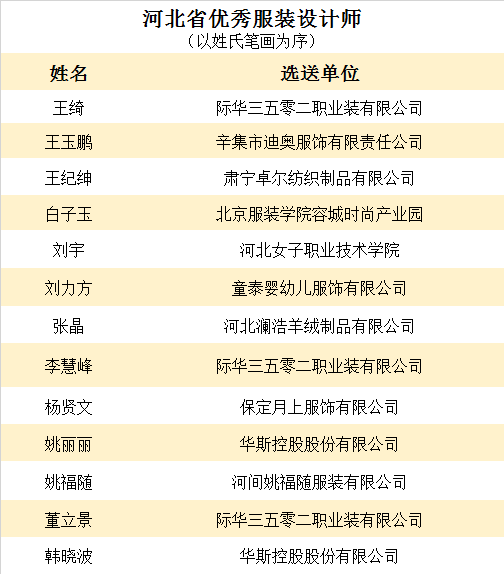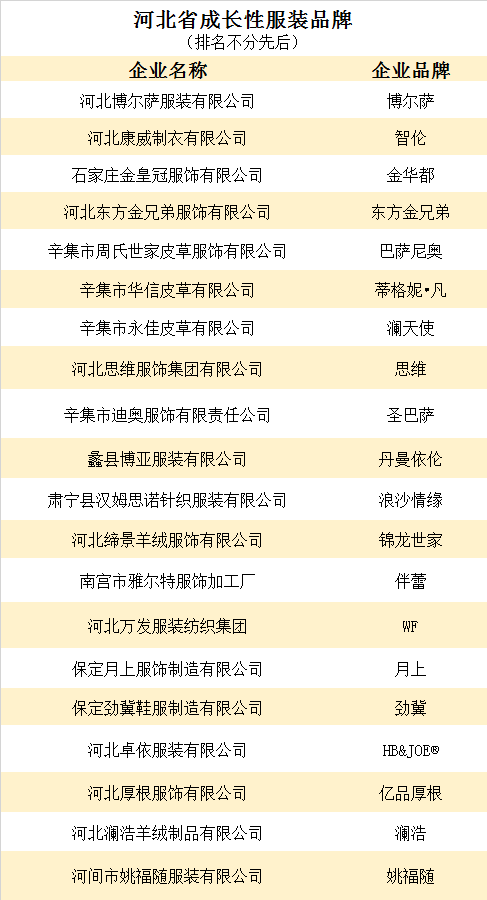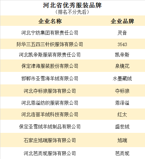 根据河北省工信厅《关于组织开展河北省服装设计大赛的通知》,经自愿申报,河北省纺织与服装行业协会邀请有关专家组成专家评审组,对申报的企业和个人进行评审。评审专家组根据评分细则,从经济指标、质量保证情况、获奖情况、技术开发情况、市场评价等方面对申报企业及品牌进行综合评分,评选出“河北省十大服装品牌”10个、“河北省优秀服装品牌”11个、“河北省成长性服装品牌”20个。