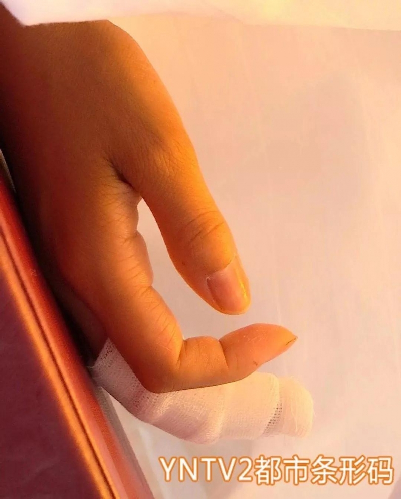 陈女士:“我的手被卫生间的门夹到,中指被切断了。我当时就晕了,我不知道怎么回事?我一看手怎么没了一截,后来我一看在地上,我自己就拿着给放回去了。”
