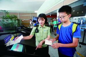 当天下午,南京机场出境大厅边检自助查验通道处,出境旅客在边检警官引导下,按照“扫登机牌、刷护照、按指纹拍照片”3个步骤,顺利完成出境边检查验手续,最快9秒通关。