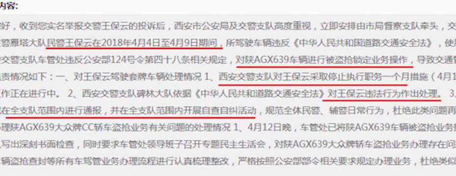 5月30日,西安市公安局信访回复:经核查,交警王保云所驾驶车辆违法、驾驶套牌车情况属实,随即将其停职给予处分,全支队通报。