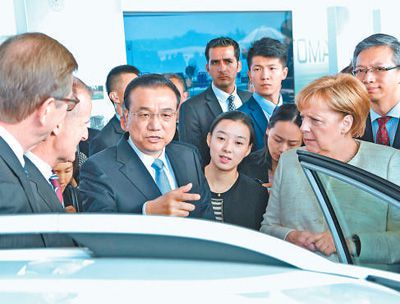 李克强详细询问双方合作情况、企业各自所占股比以及汽车传感系统、续航能力、交通大数据收集分析等技术细节。当得知德国汽车企业同中国高等院校开展全面合作,不仅包括自动驾驶技术,还包括城市交通管理大数据研究和创新创业教育时,李克强高兴地鼓励双方要以更加开放的心态开展合作。李克强特别指出,中国人口众多、各地发展水平和交通状况存在差别,希望德方立足中国市场,结合中国国情,把技术和研究做扎实。