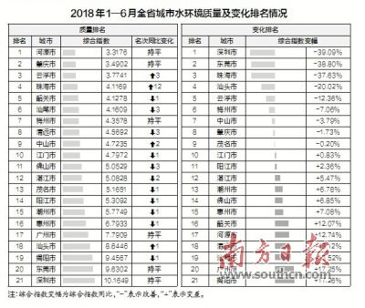 按照地表水省考断面综合指数排名,1—6月,前3位为河源、肇庆、云浮市,后3位为深圳、东莞、揭阳市。与去年同期相比,深圳、东莞、珠海等9市有所改善,揭阳、广州、汕尾等12市变差。(记者/谢庆裕 通讯员/粤环宣)