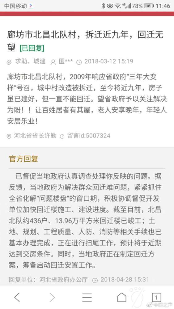 项目所在的辖区安次区政府相关负责人称,安次区委区政府对此事高度重视,但主体责任和工作都在凯创公司,目前他们已成立工作组,加大对群众的解释说明工作。预计2018年底让群众入住安置房。