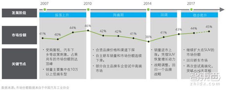 如果仅聚焦2010-2017年,这是自主品牌发展最为跌宕的几年,从前期经历销量滑坡,到尝试中高端市场折戟,再到最近两年凭借一系列设计出色、品控和性能皆能匹敌合资品牌的拳头产品,稳步扩大其在SUV的领先优势,甚至部分品牌成功突破15万元的天花板。