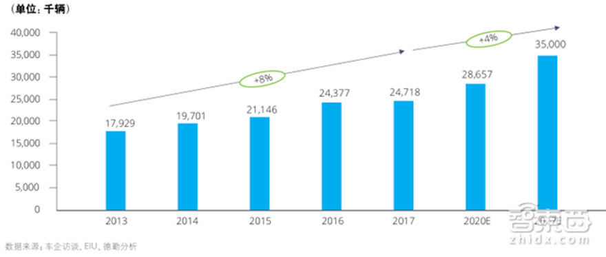 截至2017年末,中国千人汽车保有量约为150人,相较成熟汽车市场仍存在较大差距。德勤预计,到2020年中国乘用车销量有望达到2,800万辆,2027年将突破3,500万辆,年均复合增长率放缓至4%左右。