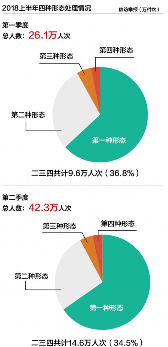 2018年上半年,全国纪检监察机关运用监督执纪“四种形态”处理68.4万人次。其中,第一种形态44.2万人次,占“四种形态”处理总人次的64.6%;第二种形态18.9万人次,占27.7%;第三种形态3.2万人次,占4.7%;第四种形态2.1万人次,占3%。