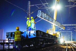 随着吊车发动,刚刚从硬横梁上下来的彭梦涛又顺手扯住了钢丝绳,用力将硬横梁转90度,以便从电力接触网中间穿过。