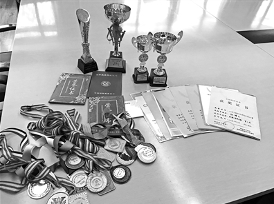 一桌子奖牌、奖杯、奖状