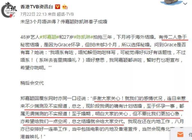 早前,港媒称二人此次成婚是因为陈凯琳已经怀孕,但因未满三个月所以会选择秘婚。不过,郑嘉颖在接受采访时否认了这一传言,称二人确有结婚计划,但怀孕之事纯属谣传。