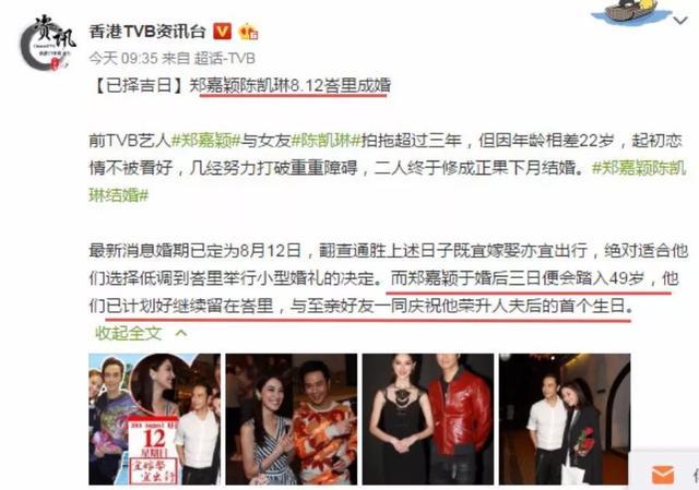 郑嘉颖自被曝光与小自己22岁的陈凯琳相恋以来,就一直不被外界看好,而日前港媒报道称,两人恋情已修成正果,将于下月12日在巴厘岛完婚。