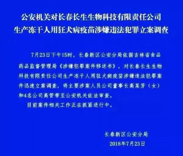 7月23日,长春公安发布警方通报,称已对长春长生生物科技有限责任公司生产冻干人用狂犬病疫苗涉嫌违法犯罪案件立案调查,将主要涉案人员待会公安机关依法审查。