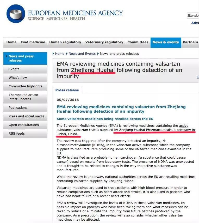 针对检测结果,EMA于7月5日发布了公告,“指名”召回含有华海药业缬沙坦原料的药品。