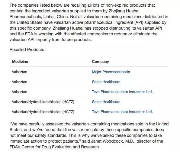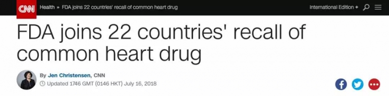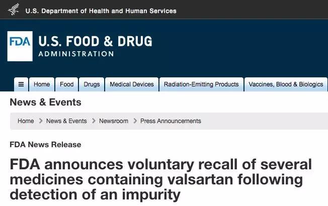 7月13日,美国食品药品监管署(FDA)发布通告,宣布召回涉及三家制药公司Major Pharmaceuticals、Solco Healthcare及Teva Pharmaceuticals Industries生产的5种缬沙坦药物;